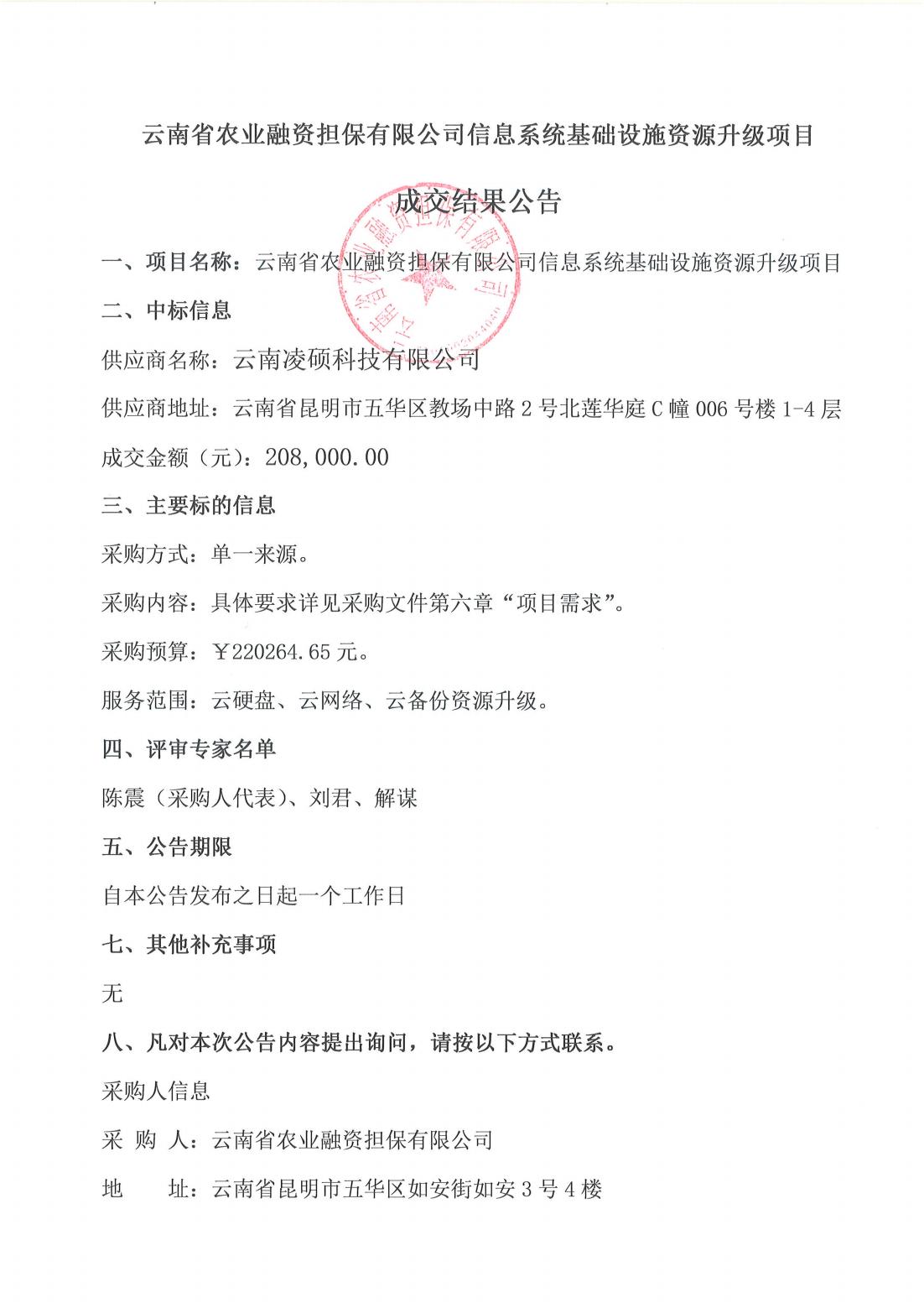 云南省農(nóng)業(yè)融資擔(dān)保有限公司信息系統(tǒng)基礎(chǔ)設(shè)施資源升級項目成交結(jié)果公告