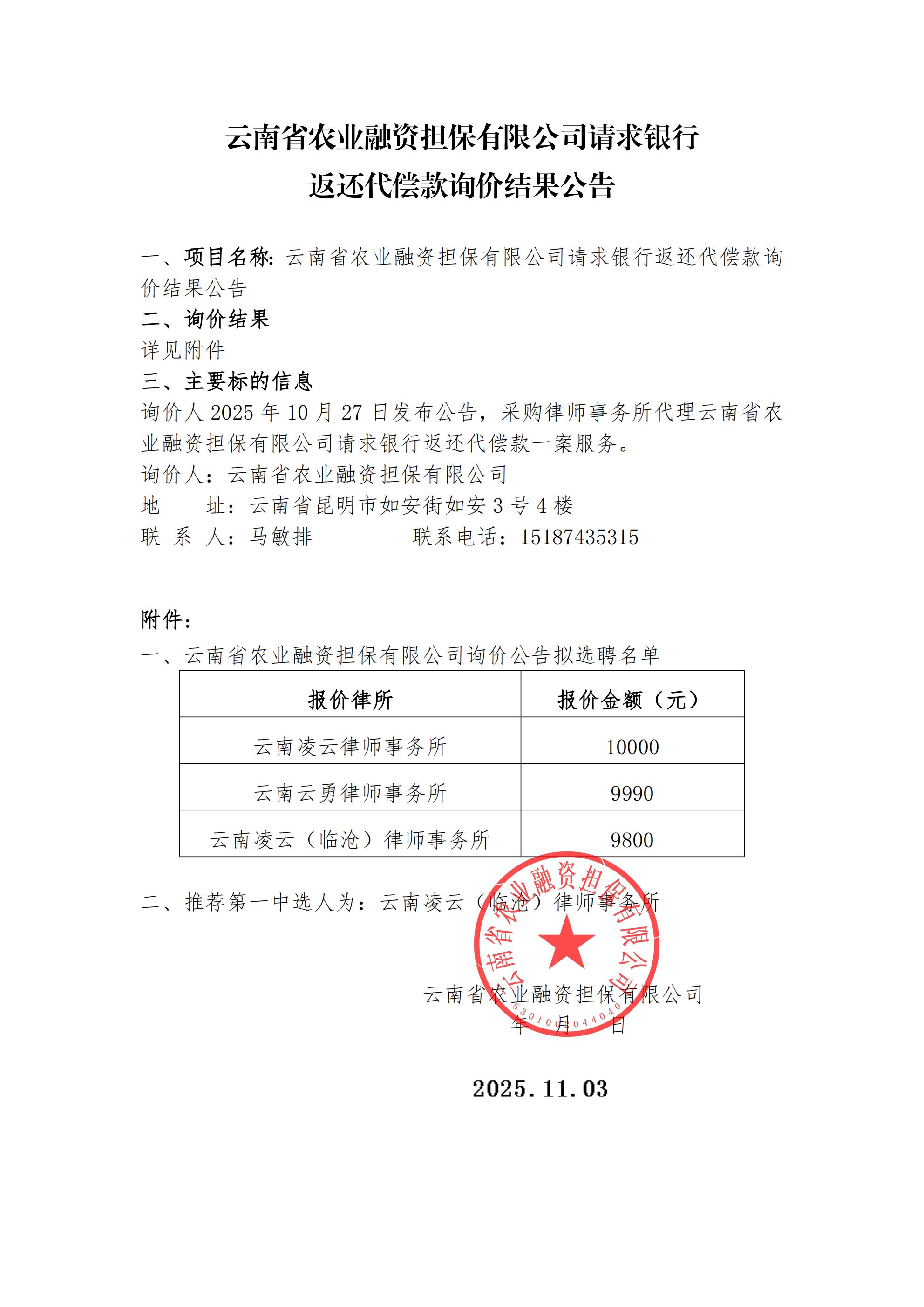 云南省農(nóng)業(yè)融資擔(dān)保有限公司請(qǐng)求銀行返還代償款詢價(jià)結(jié)果公告