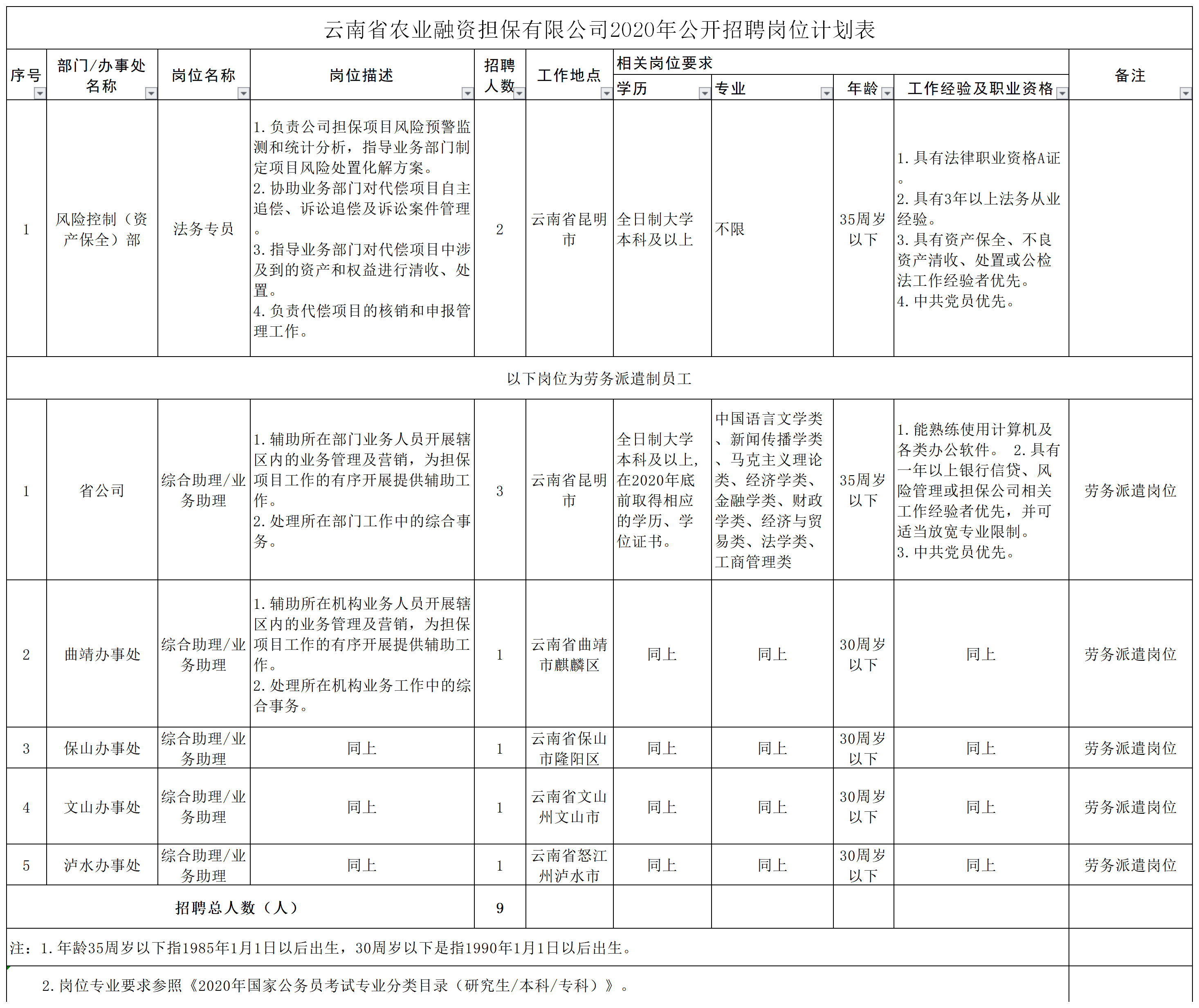 附件:云南省農(nóng)業(yè)融資擔(dān)保有限公司2020年公開招聘崗位計(jì)劃表
