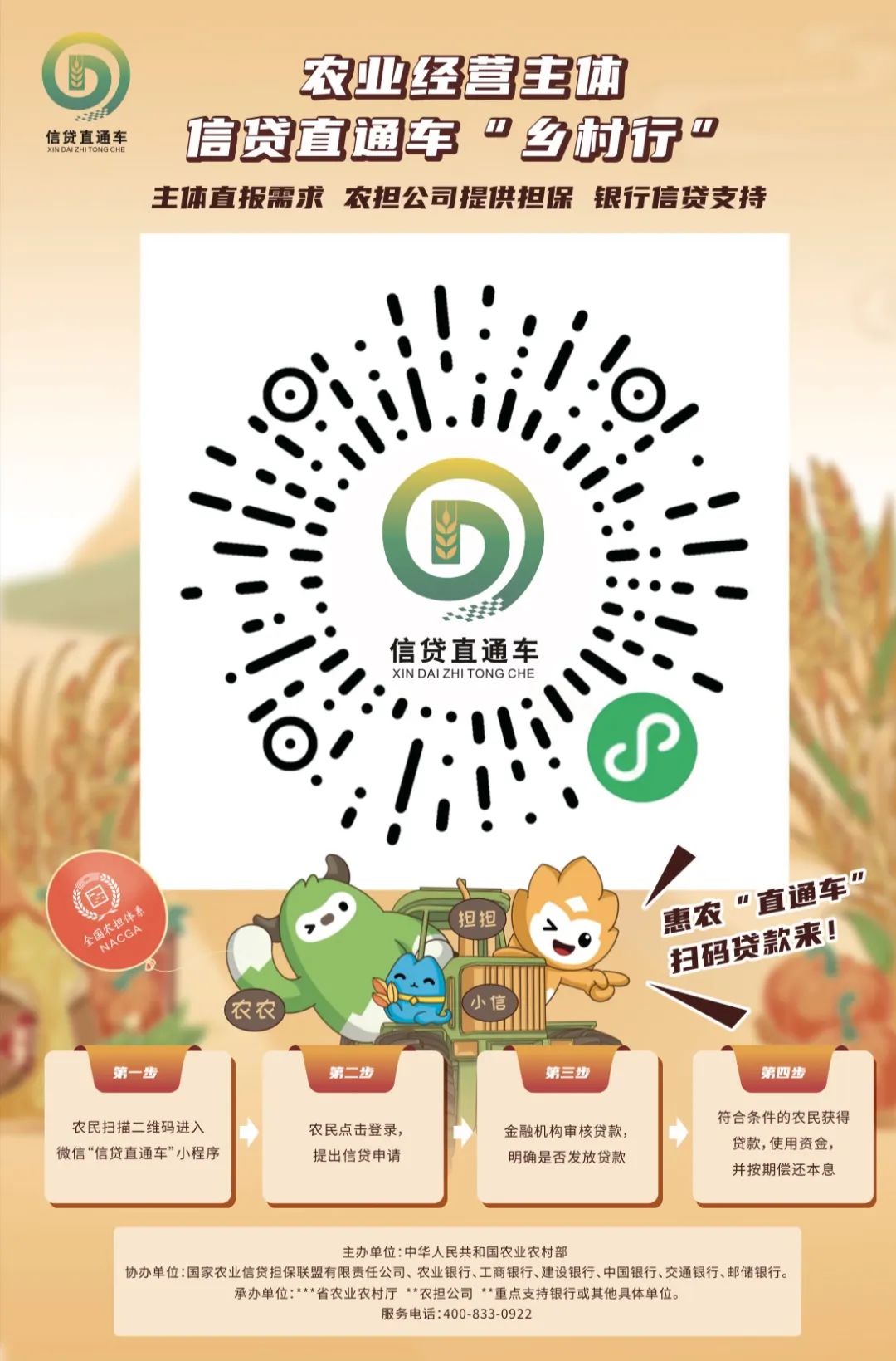 據(jù)悉,“鄉(xiāng)村行”活動將通過集中開展信貸直通車專題宣傳推廣,引導大中型銀行機構(gòu)服務下沉,將更多的農(nóng)業(yè)農(nóng)村信貸、擔保、信用、保險等金融知識普及到村到戶,只需掃描宣傳掛圖中的二維碼即可提出融資需求,進一步提升信貸直通車社會知曉度和品牌影響力,擴大農(nóng)業(yè)經(jīng)營主體的覆蓋面和受益面,將更多金融資源引村入戶,助力今冬明春糧食生產(chǎn)和鄉(xiāng)村建設(shè)