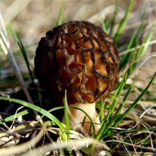 黑色遮陰網(wǎng)下,密密麻麻的菌床上長(zhǎng)滿了成熟的羊肚菌。